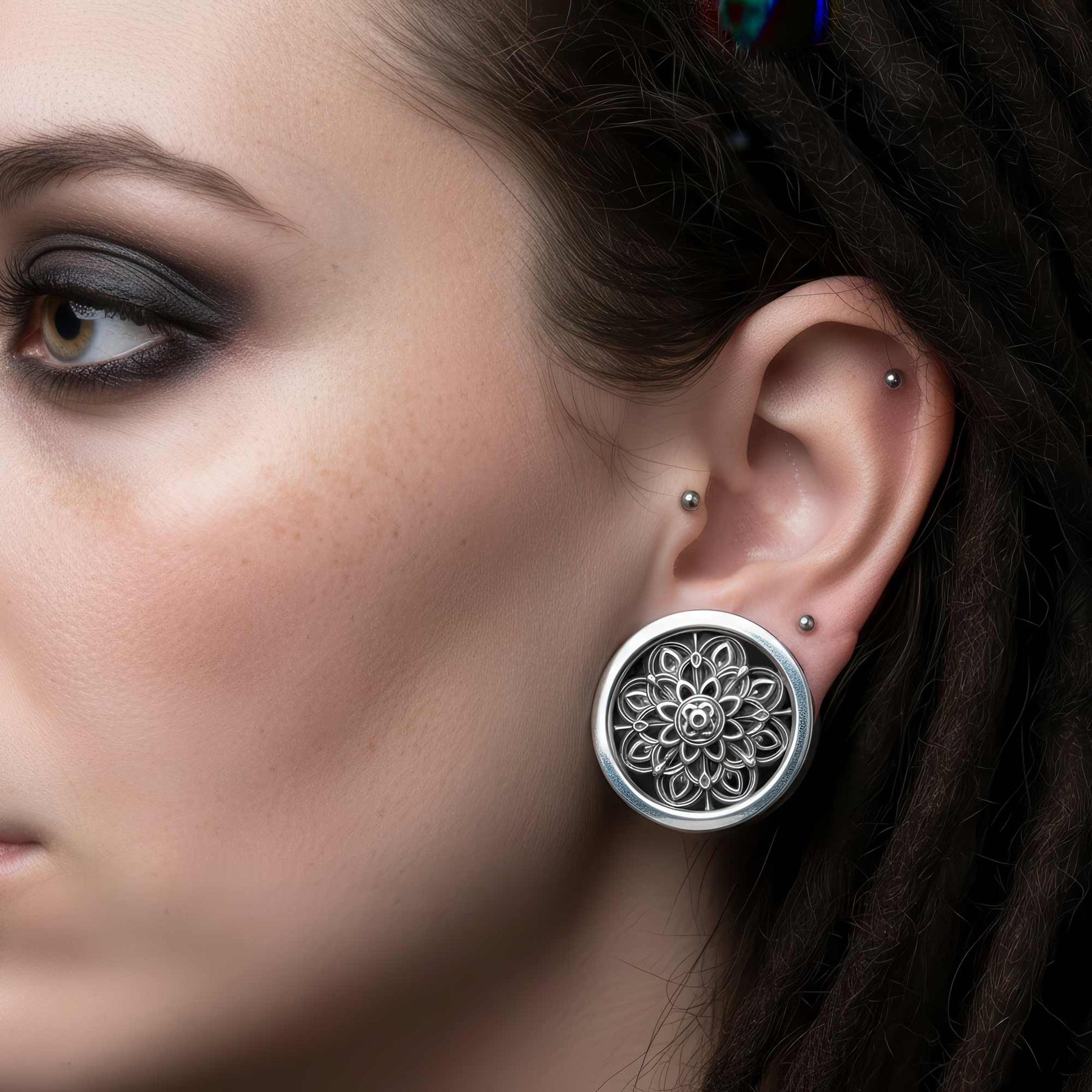 Ein außergewöhnliches Stück, bei dem sakrale Architektur auf Schmuckkunst trifft. Dieser Ohrtunnel aus 925er Sterlingsilber verfügt über eine durchbrochene Rosette, die von den Buntglasfenstern und Ornamenten großer gotischer Kathedralen inspiriert ist.