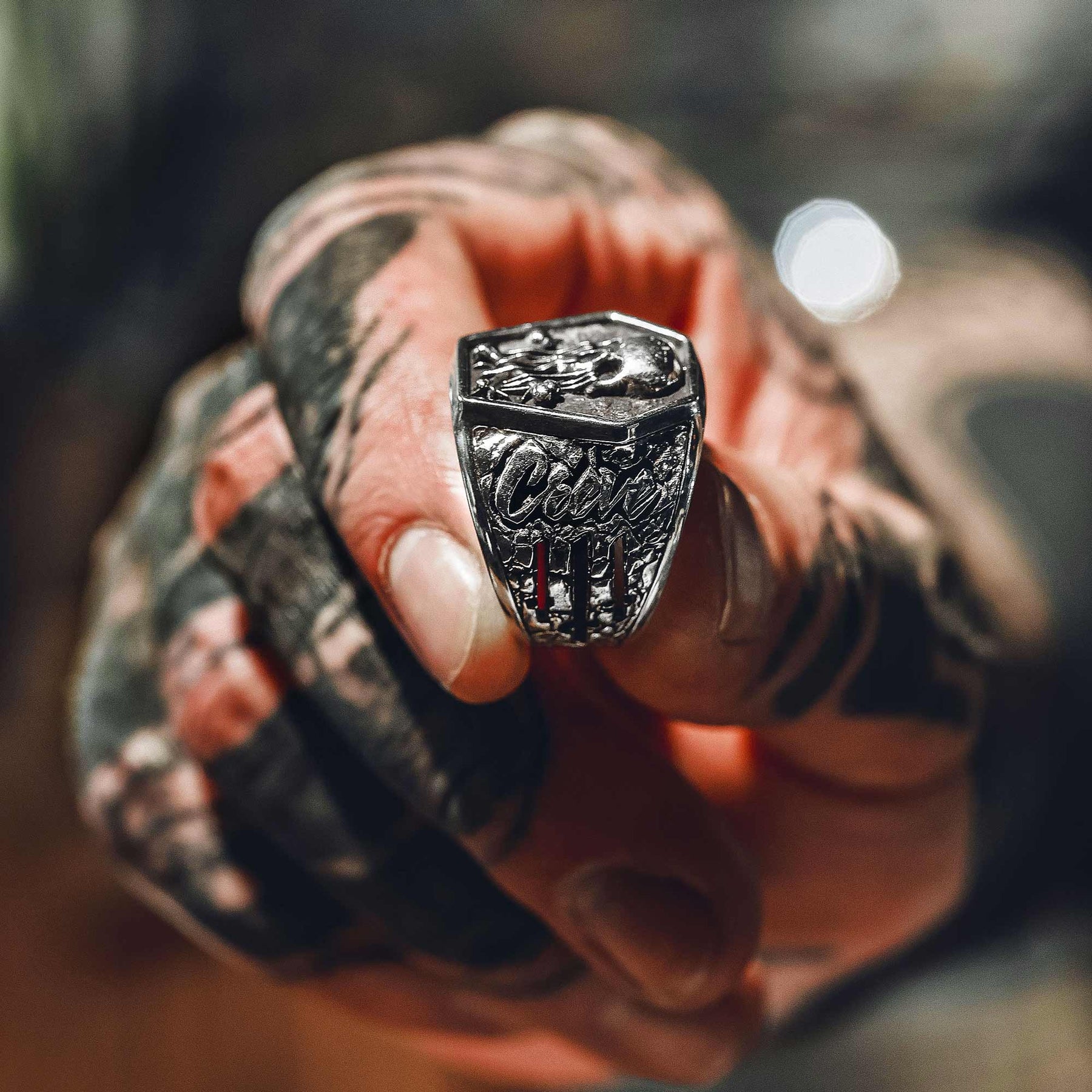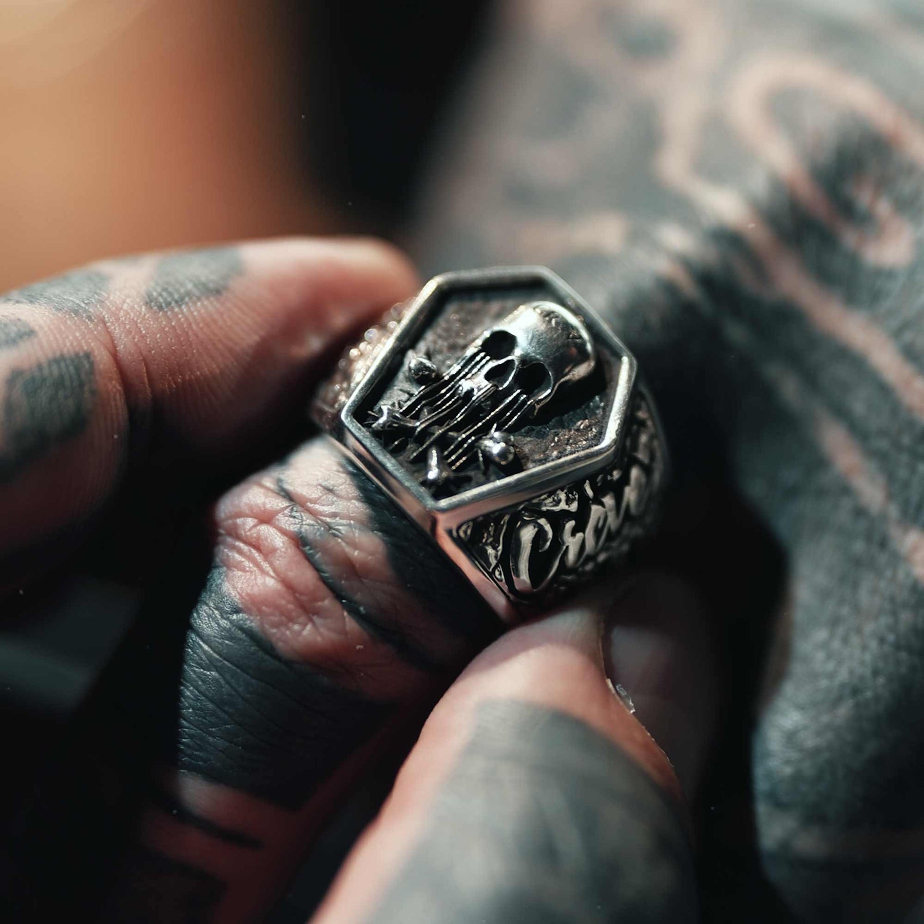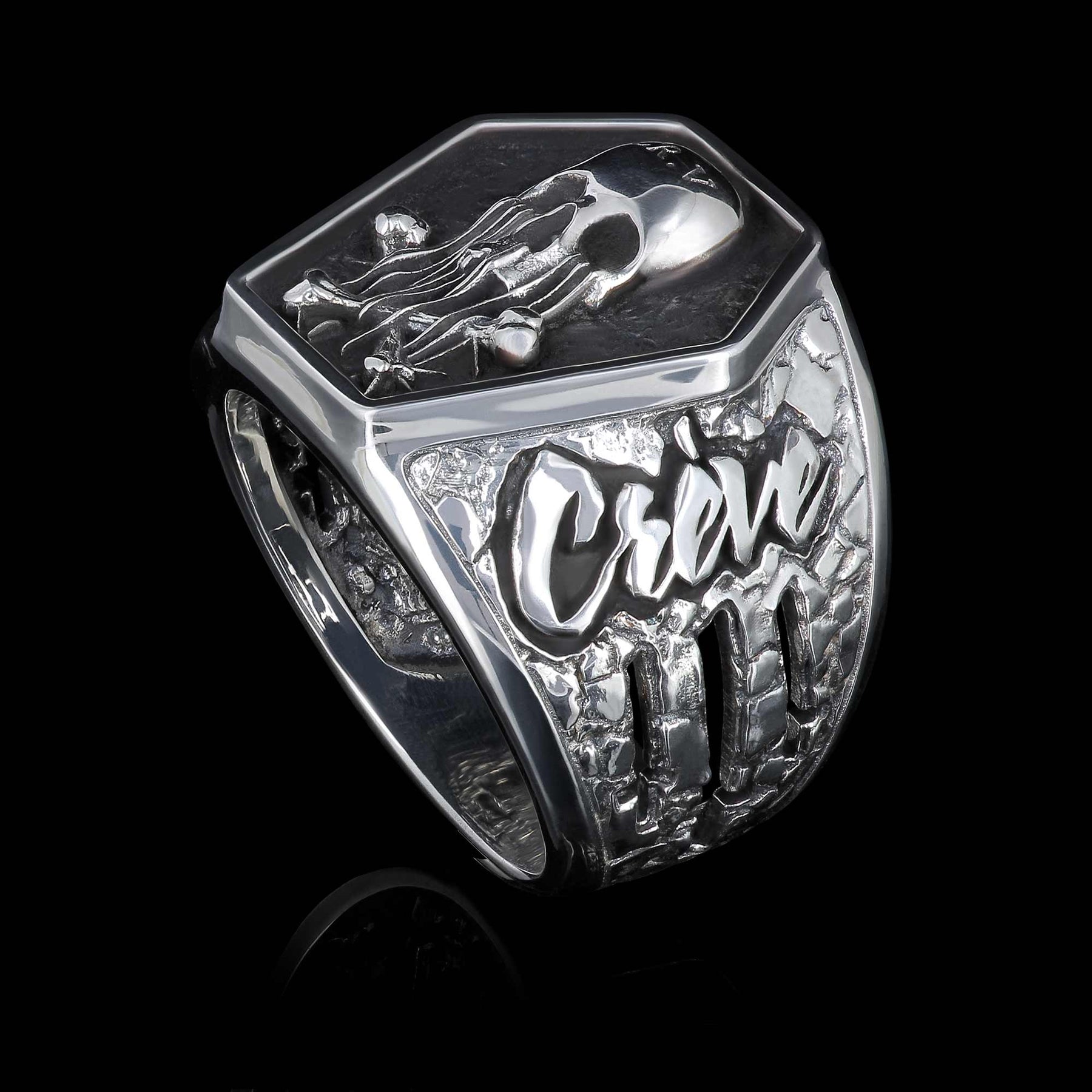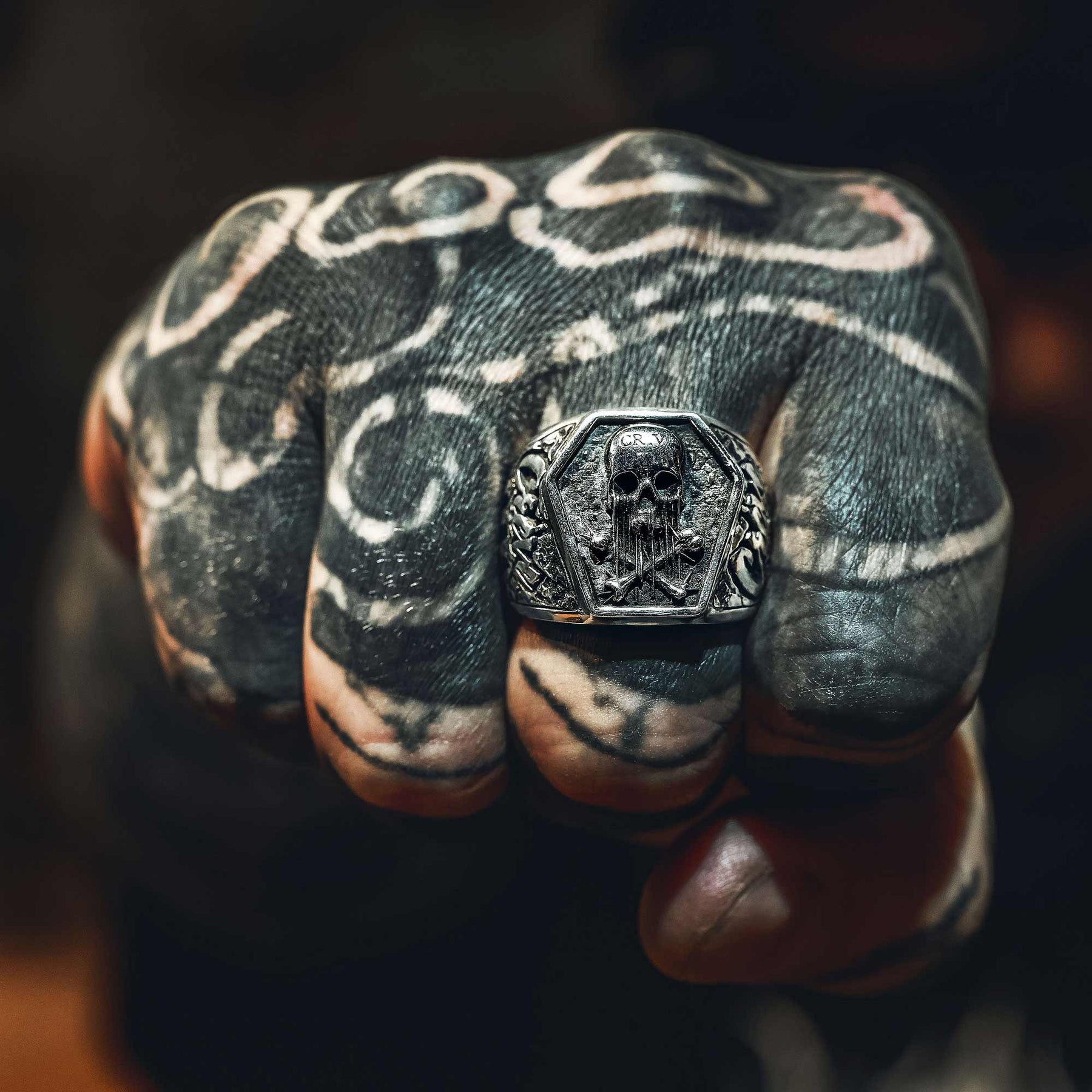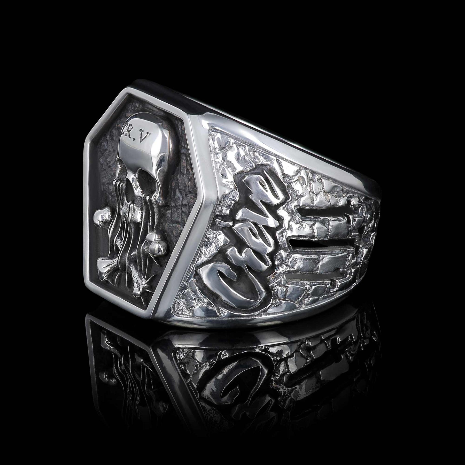Sur le plateau, un crâne sculpté en relief, gravé “CR.V”, qui fond littéralement et dégouline en os croisés façon avertissement. Les côtés sont martelés comme de la pierre déchirée, et portent le message : “Crève”. Pas de subtilité. Pas d’excuses. Les 3 croix inversées sont ajourées directement dans le corps de la bague.