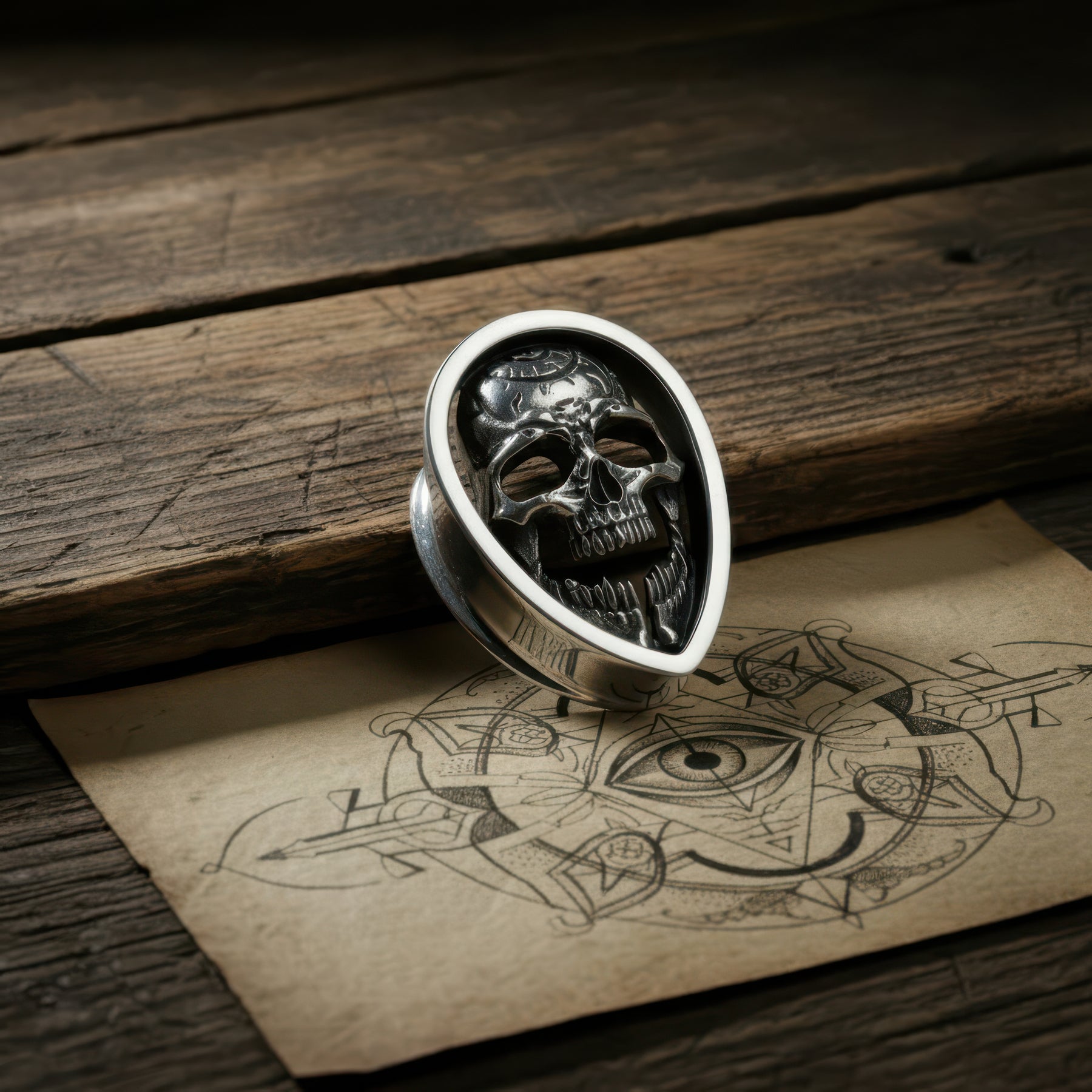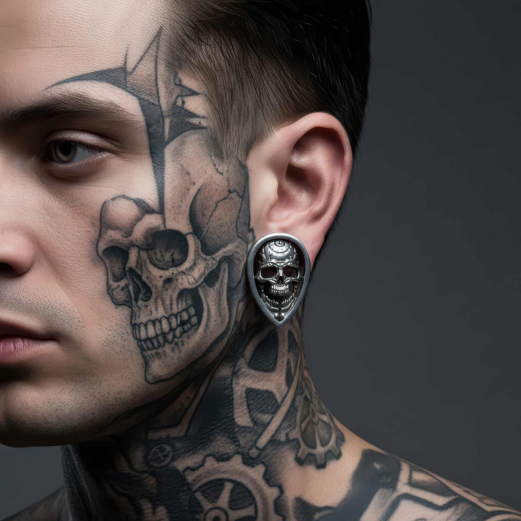 Ein dunkles und faszinierendes Schmuckstück für Liebhaber starker Ästhetik. Dieser Ohrtunnel aus massivem 925er Silber zeigt einen tief geformten Totenkopf , eingerahmt von einer umgedrehten Tropfensilhouette mit eleganten Linien.