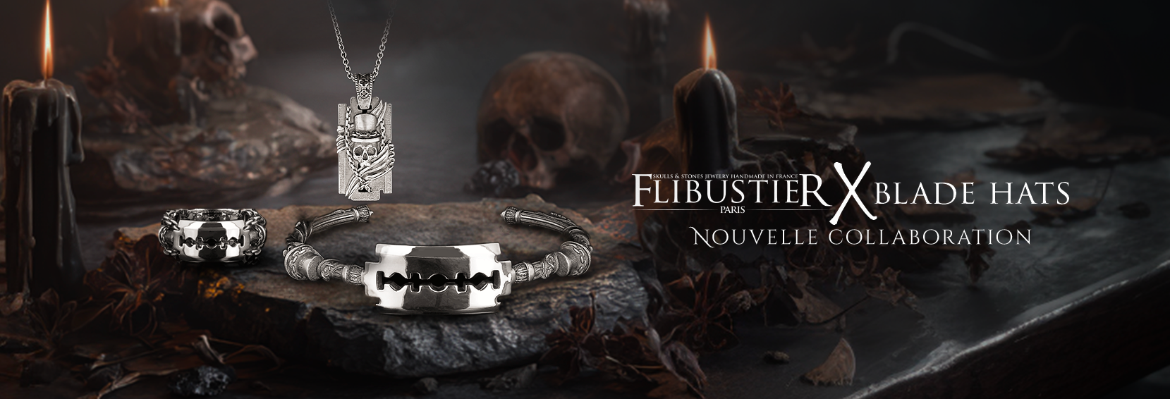 From its Galician workshops, Blade Hats styles the heads of Marilyn Manson, Slash, Alex Terrible, and The Wu. Its hats adorned with razor blades, chains, and burnt leather have become the signature of an entire international music scene. For our part, Flibustier shapes sterling silver jewels for modern pirates. This encounter between two artisans passionate about metal (music & material) has given birth today to the Mad Hatter Collection : three pieces inspired by Blade Hats' wardrobe—theatrical drapes, dangling chains, sharp razor blades—and enhanced with Gothic details reminiscent of the Cathedral of Santiago de Compostela, a legendary stop on our travels.