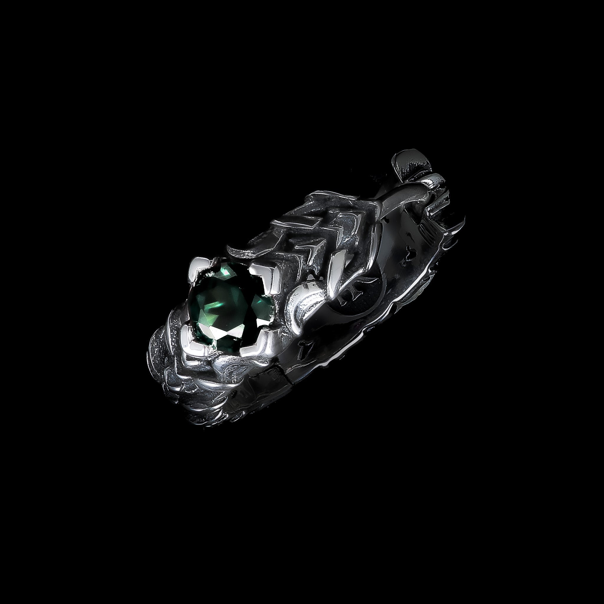 A fallen kingdom, a forgotten suit of armor. The Sombre Couronne hoop earrings echo the intricate motifs of the eponymous ring—scales of forged steel, claws reaching towards an emerald green cubic zirconia . Worn as a pair, they evoke the last vestiges of a crown swallowed by history.