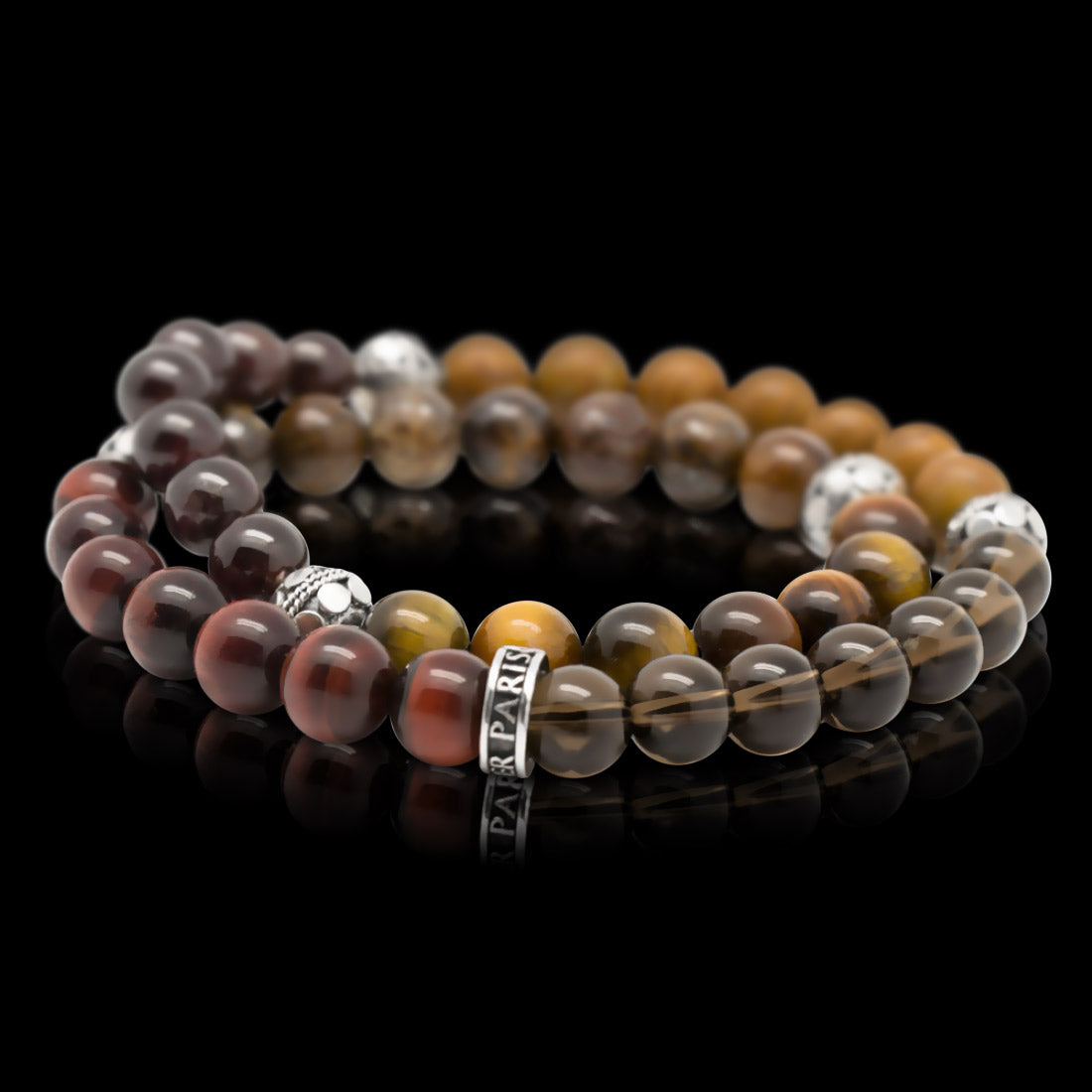 J'adore ce mélange des pierres et bois l’œil du tigre, l’œil du taureau et le quartz fumé toujours aussi hypnotique. Et ces couleurs se porte avec tout.