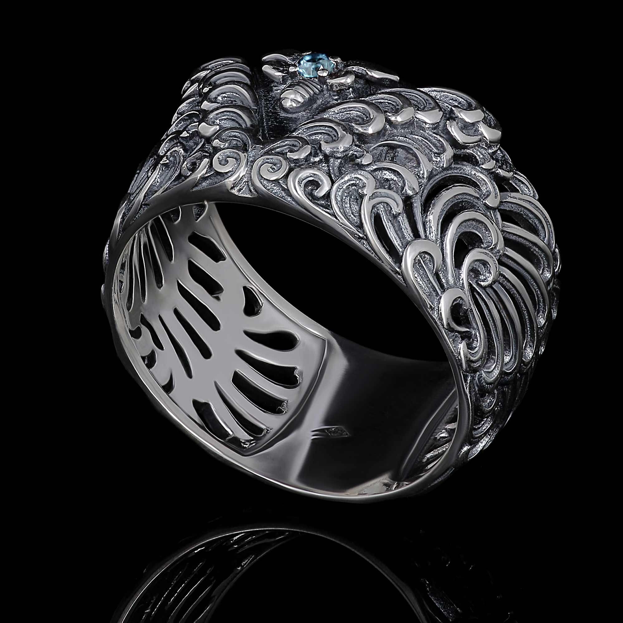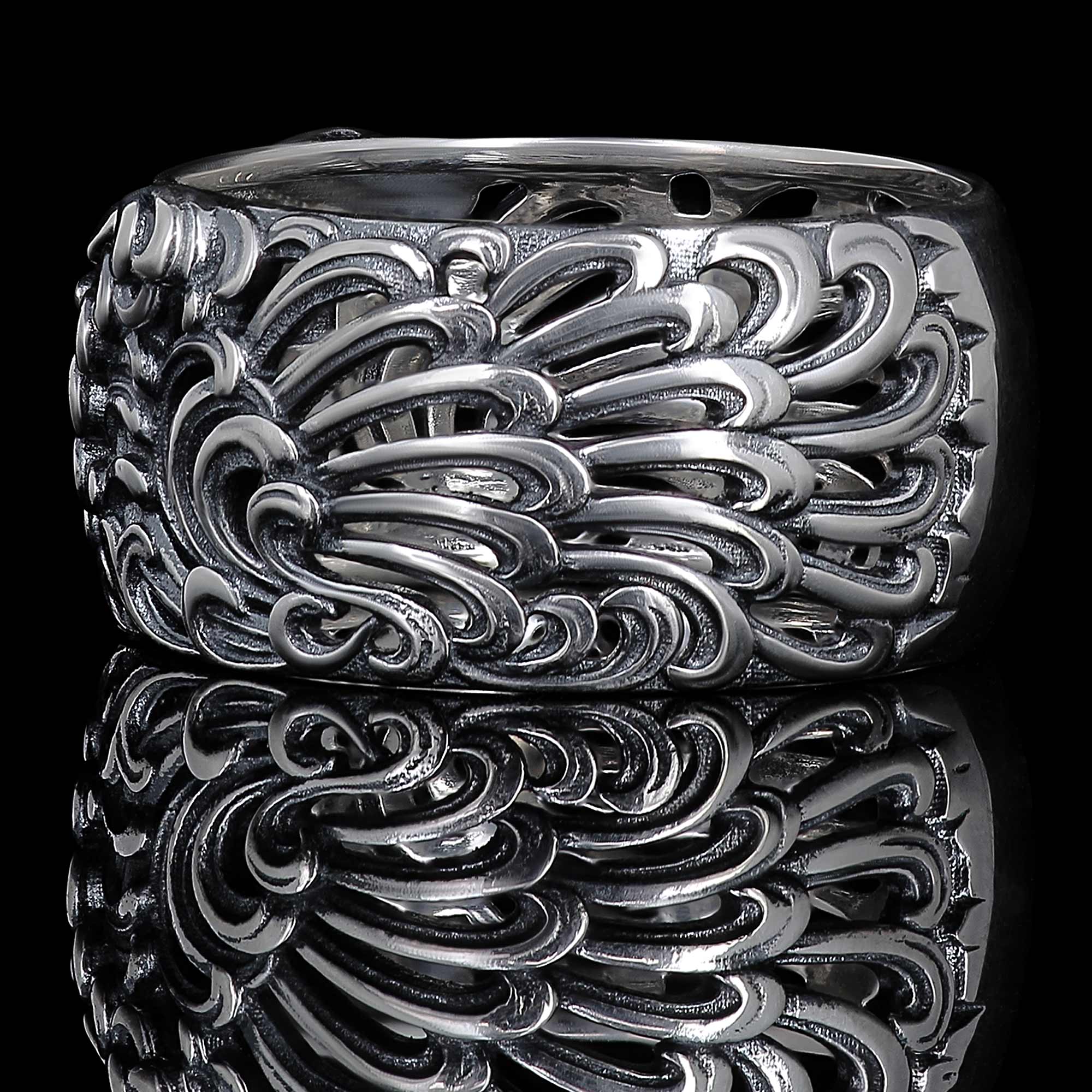 Forgée en argent massif, la bague est sculptée de vagues profondes et continues. Un mouvement fluide, dynamique, maîtrisé.