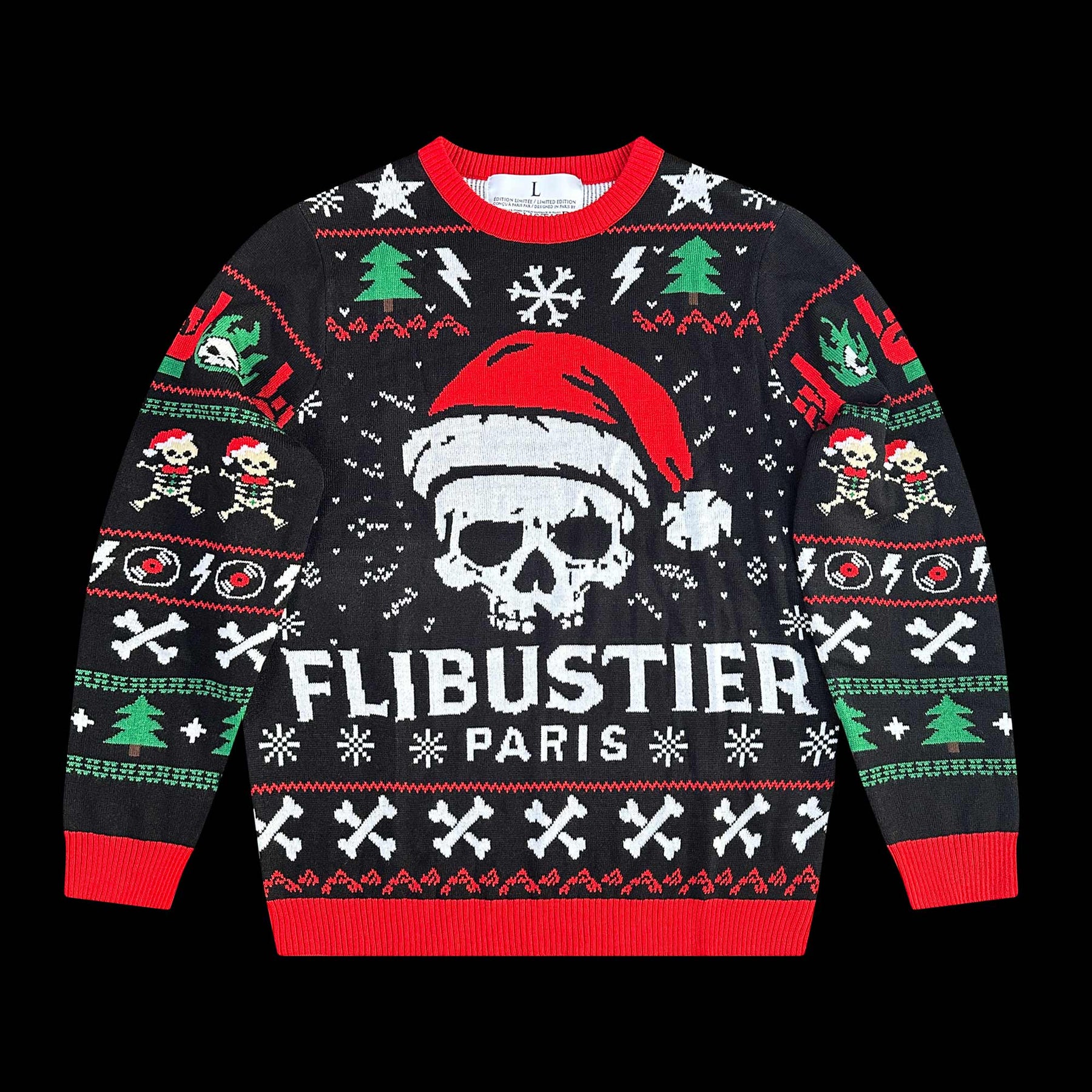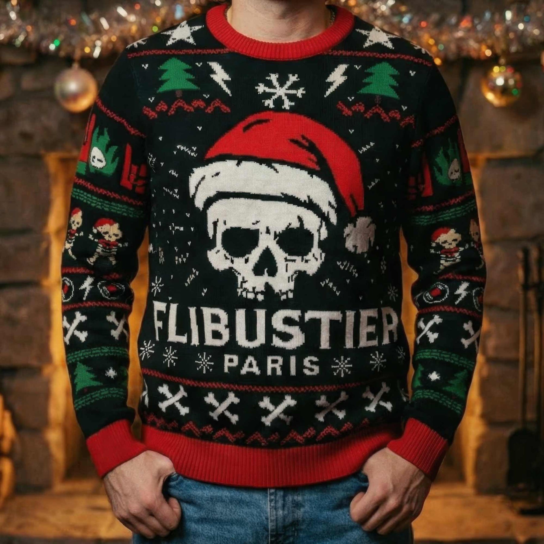 Le pull moche de Noël by Flibustier fusionne l'esprit festif avec une touche de rock. Ce tricot arbore des motifs rock singuliers qui transforment les traditions de Noël en déclaration de style. Parfait pour ceux qui refusent la banalité des pulls de saison classiques. Oh ! et on a même pensé aux enfants (à partir de 6 ans) si vous voulez être assortis sur les photos de famille... On ne juge pas!